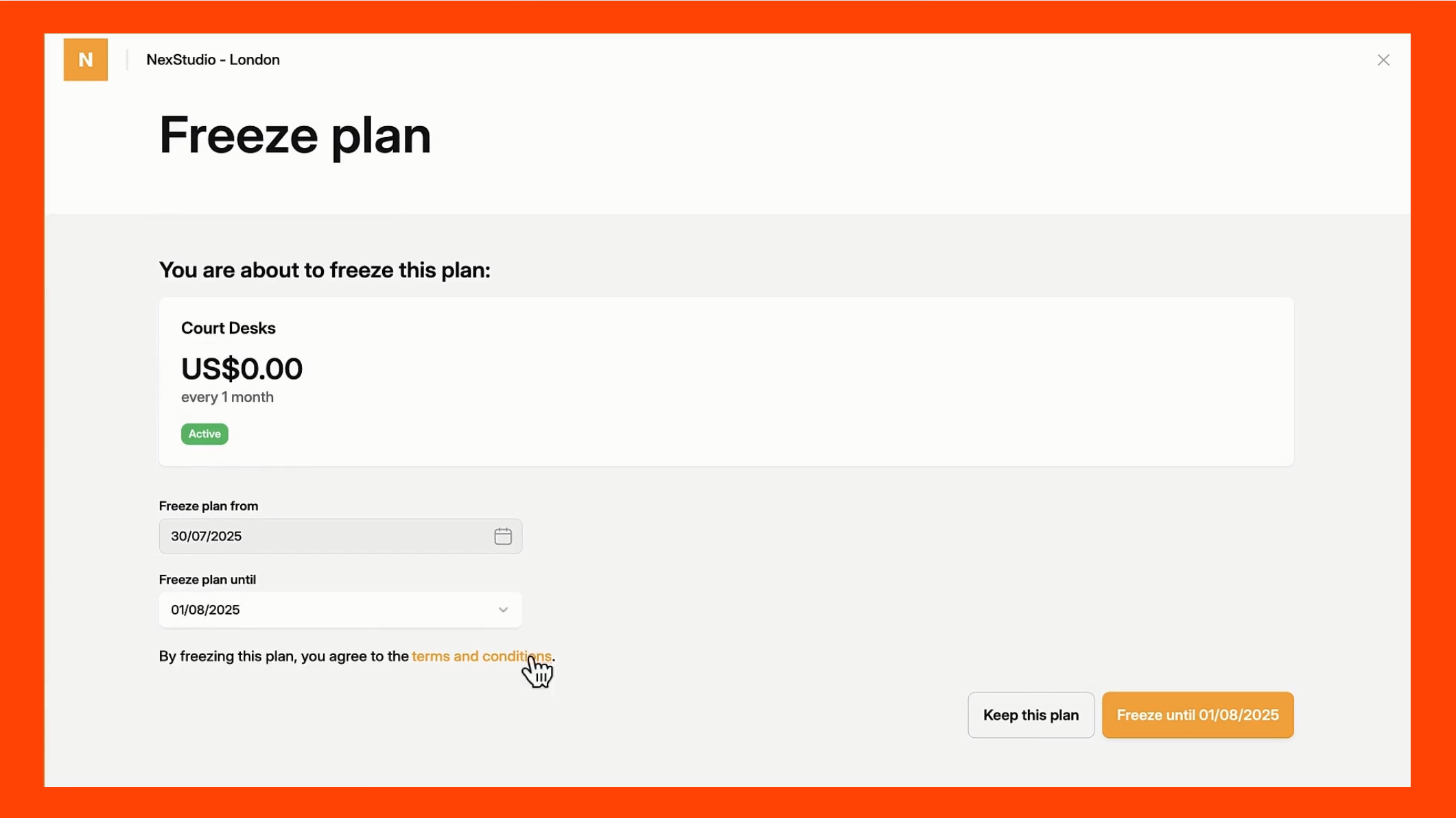 If you’ve enabled freezing for a plan, members can freeze plans themselves and choose how long for, according to the limits you’ve set. They can resume at any stage, or let the system reactivate once the freeze period ends.